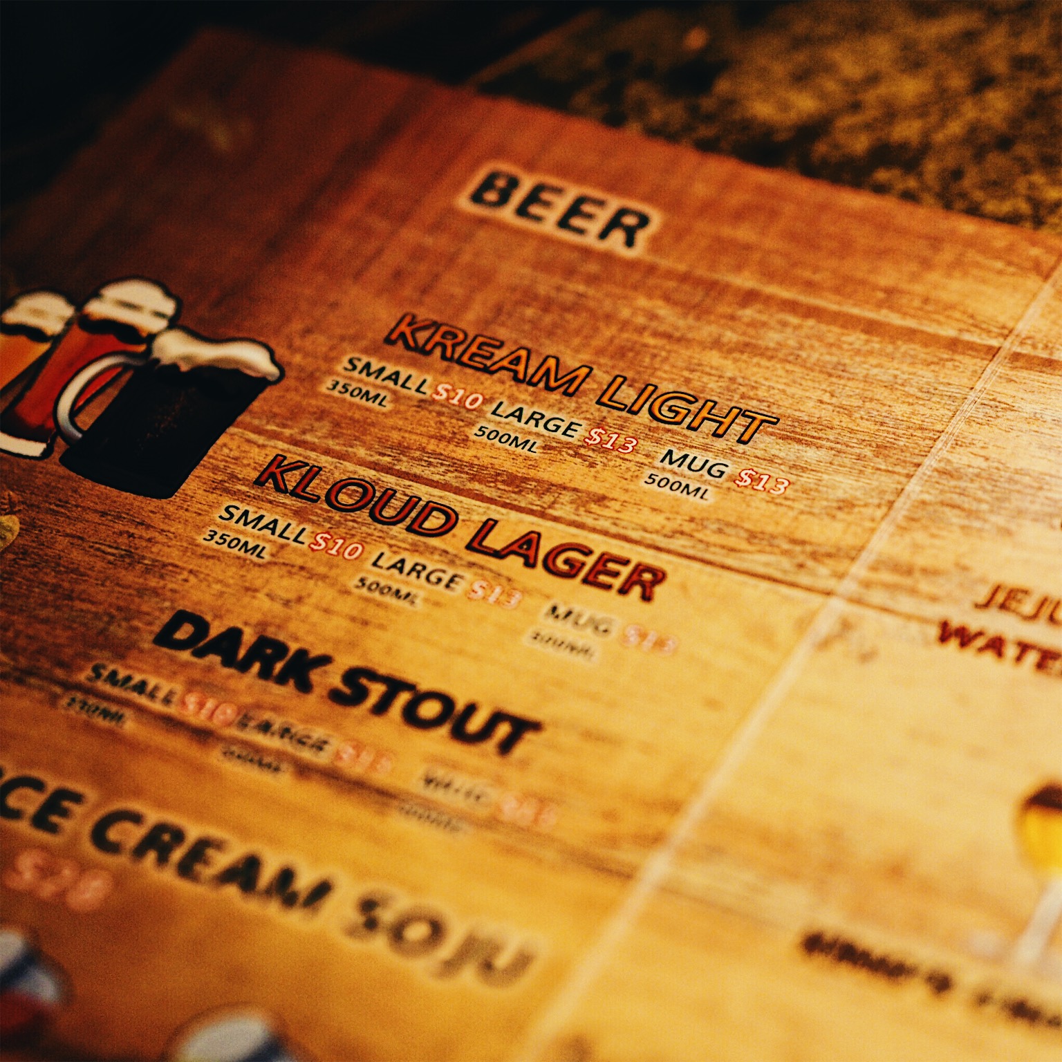 I took a seat on the side of the room, about halfway between the back wall and the entrance. There were a good seven or eight tables along the side suitable for two or three or four people. At the back were a couple more tables, some slightly larger and at the front, just inside the door, was a more group friendly/oriented bench where six to eight people could get comfy. I took up my seat, and was simultaneously presented with a menu from the nice lady working there. The menu here isn’t very long, it doesn’t need to be. They do a handful of drinks and they do them well. They offer food as well, which seemed to be very popular from looking around but I’d just gone crazy with chicken satay not too long before so I was well sorted there. The menu starts with the three beers you can get, Light, Lager and Stout. It then goes into the Soju section and back into the beers, this time mixed with different flavours and there are cocktails, long drinks, bombs and a few shots. I was going to be working my way through the beers.